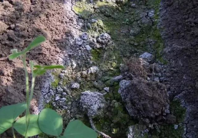鹽漬化在大棚里表現(xiàn)有三種情況:第一種是輕度鹽漬化,表現(xiàn)是地表起“綠苔”,澆水后兩三天,地面上出現(xiàn)一層綠苔;如果澆水后地表出現(xiàn)一層“白霜”,則是第二種情況——中度鹽漬化;第三種是重度鹽漬化,如果地表濕潤的話,有一塊一塊的紅色膠狀物,如果土壤干燥的時候地面表現(xiàn)為“紅磚”似的一層紅苔。這個就是土壤鹽漬化的表現(xiàn)。