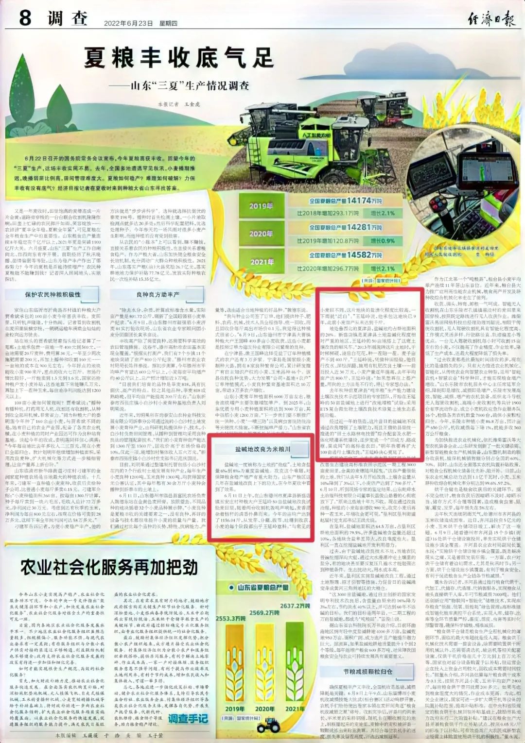 6月23日,《經(jīng)濟(jì)日報(bào)》8版刊發(fā)《夏糧豐收底氣足——山東“三夏”生產(chǎn)情況調(diào)查》,其中對夏津“鹽堿地改良為米糧川”進(jìn)行了報(bào)道。內(nèi)容如下: